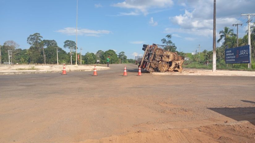 Um caminhão carregado com toras de madeira tombou na tarde desta quarta-feira, 19, no trevo que liga Jaru aos municípios de Theobroma e Governador Jorge Teixeira. O veículo vinha de Vale do Anari e seguia em direção a Jaru quando, ao realizar o contorno no trevo, acabou tombando.