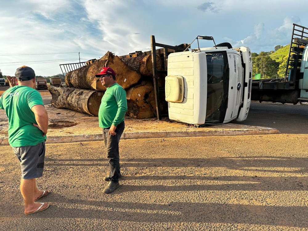 Jaru: Caminhão carregado com toras de madeira tomba no trevo que dá acesso a Theobroma e Governador Jorge Teixeira