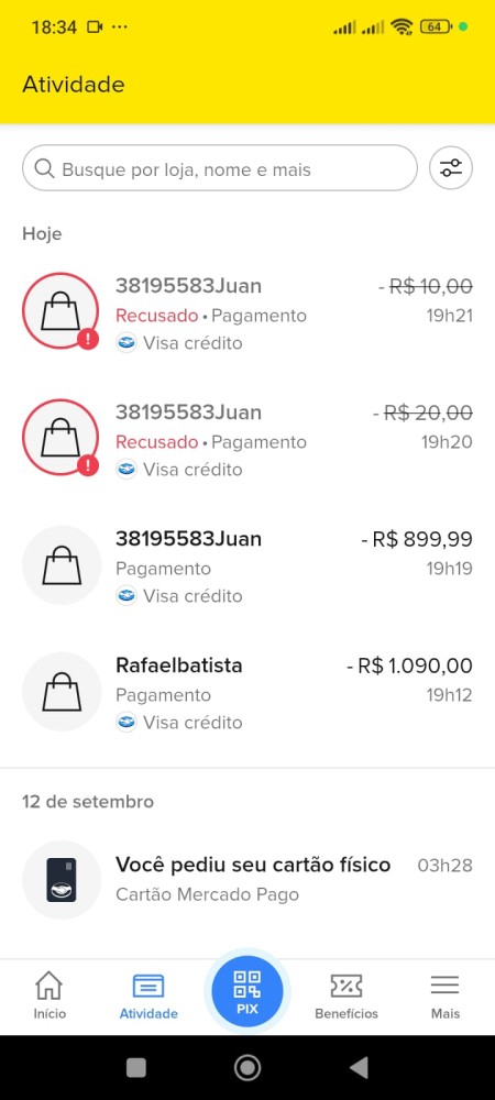 Um cliente do Mercado Pago procurou a Polícia nesta terça-feira (23) após se surpreender ao descobrir que o cartão de débito e crédito que havia solicitado já apresentava duas compras registradas, totalizando R$ 1.989,99.